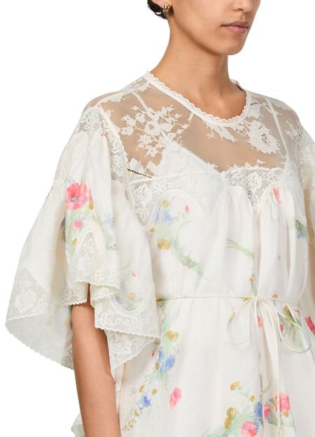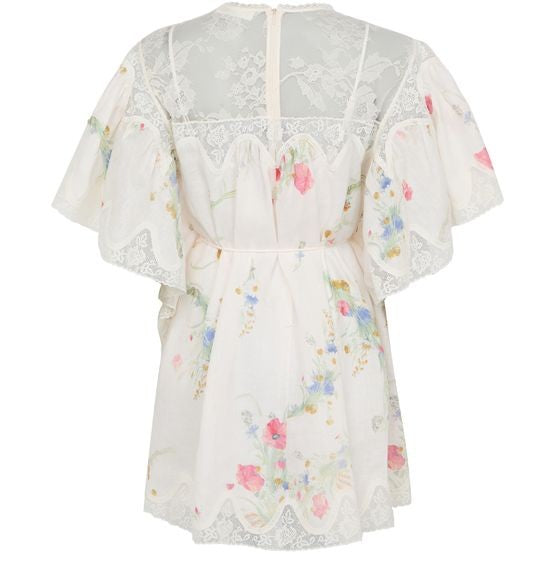 説明 : loose fit, round neck, short-sleeved, ruffled sleeve, knee length, floral print, floral embroidery, zipper closure, lace details, scalloped edges.