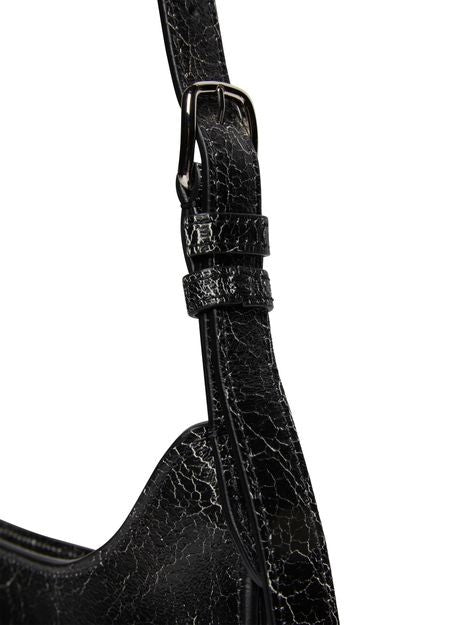 説明 : パッチディテール, アップリケロゴ, 前面ロゴ, ファスナー開閉, ナローストラップ, シルバーフィニッシュ, 肩掛け, 調節可能なストラップ.