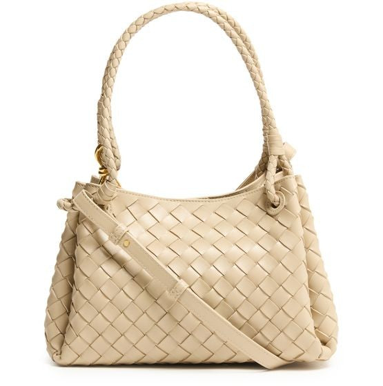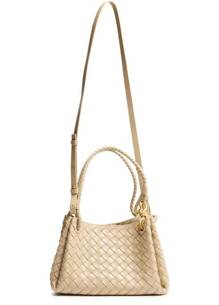 説明 : Shoulder bag, intrecciato weaving technique, double handles, thin strap, adjustable strap, single compartment, visible topstitching, gold finish.