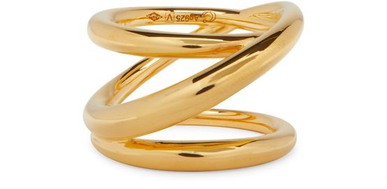 説明 : 3連リング, インターワインドリング, 際立ったアシンメトリーシルエット, ブランドロゴ エングレーブ.