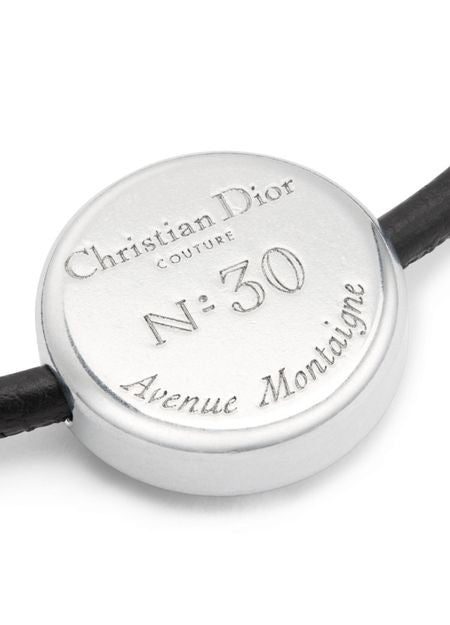 説明 : 「カナージュ」と30 Montaigneシグネチャーを刻印したダブルフェース, diorシグネチャー, シルバートーンの真鍮, スライディングノット開閉, 真鍮80%、ラムスキン20%, ドイツ製.