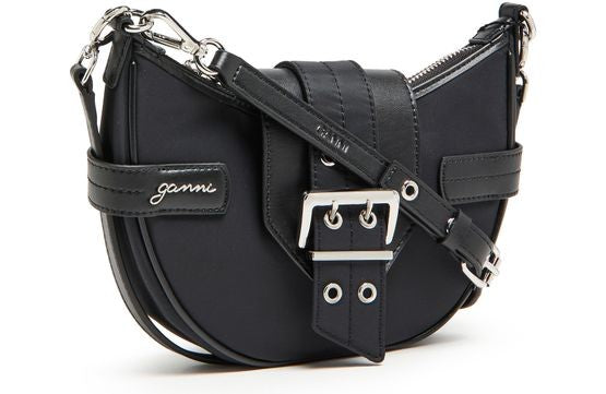 説明 : シルバーフィニッシュ, シングルコンパートメント, 銀文字ロゴ, 刻印ロゴ, 前面ロゴ, フラップ開閉式, ファスナー開閉, 飾りステッチ, バゲットバッグ, 斜め掛け.