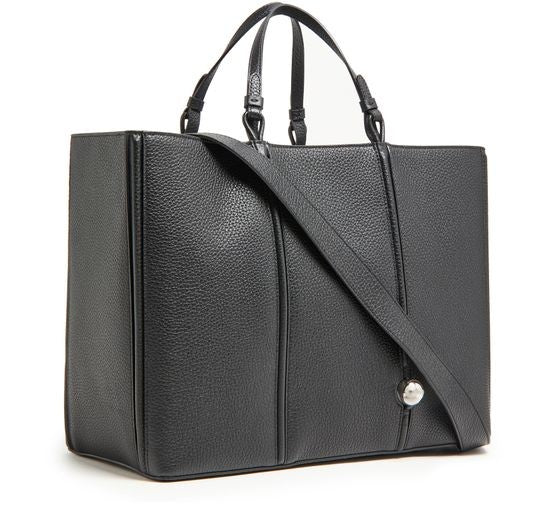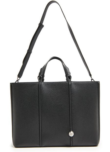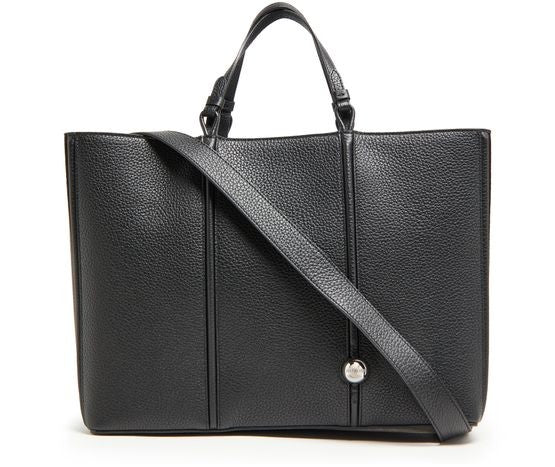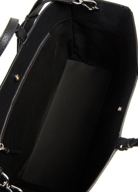 説明 : シングルコンパートメント, スナップボタン留め, 飾りステッチ, 背面ロゴ, 刻印ロゴ, シルバーフィニッシュ, トートバッグ, 手持ち, 肩掛け, ファスナー付き内ポケット.