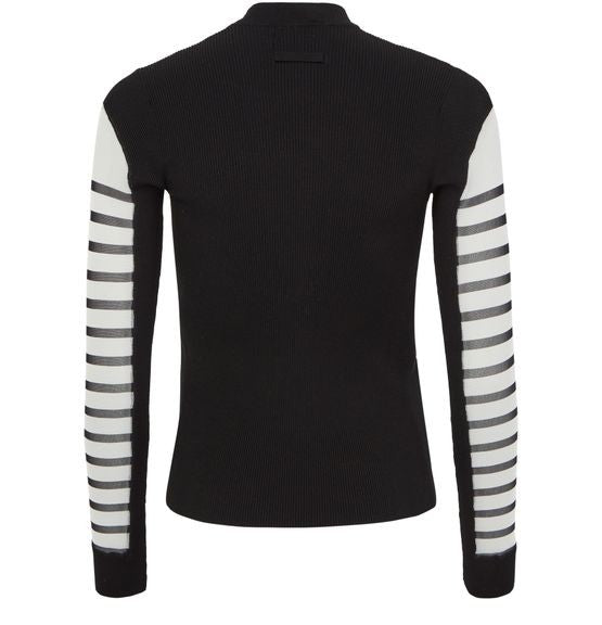 説明 : レギュラーレングス, モックネック, ロングスリーブ, ボーダー柄, カフスボタン付きスリーブ.