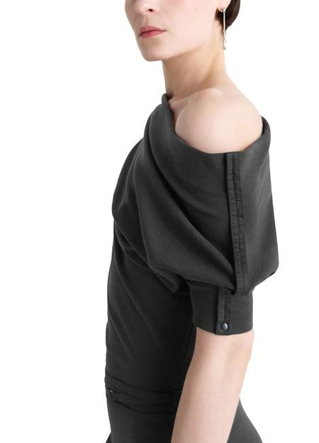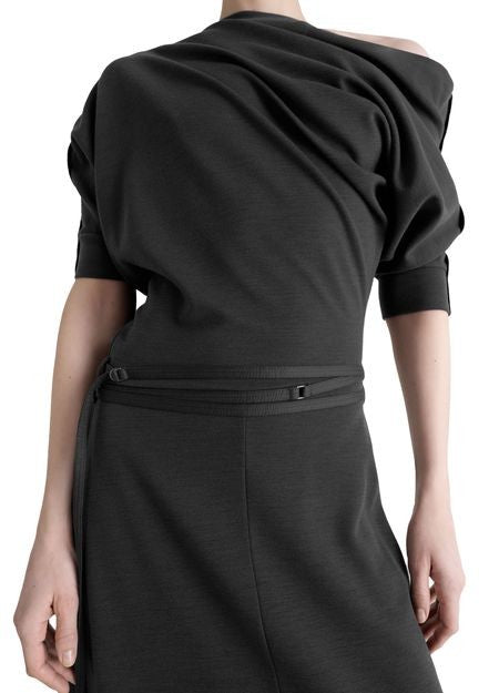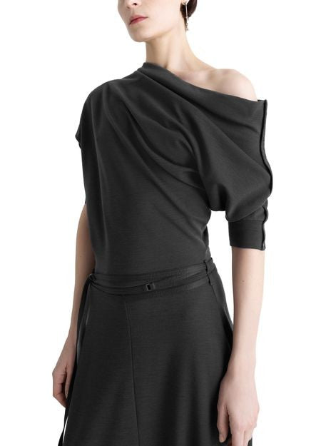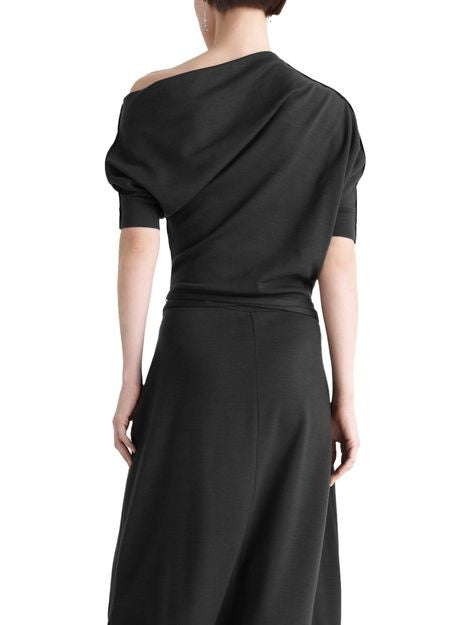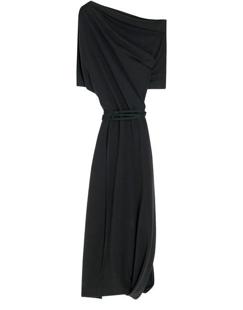 説明 : Bare shoulder, three-quarter-sleeved, dolman sleeve, maxi dress, draped detail, belted waist.