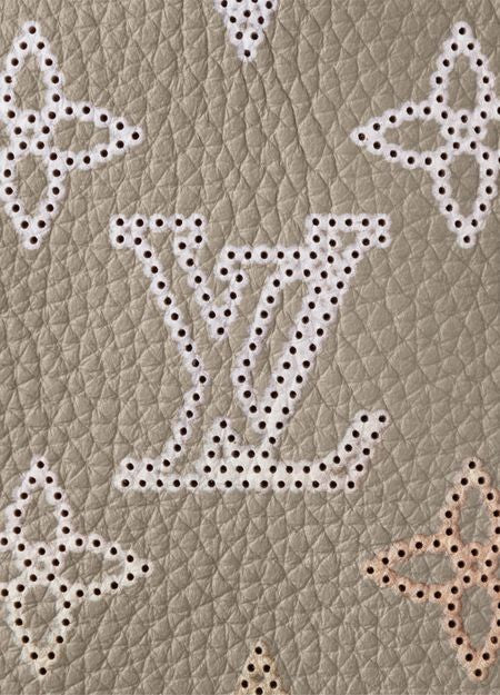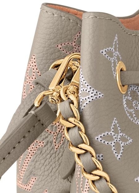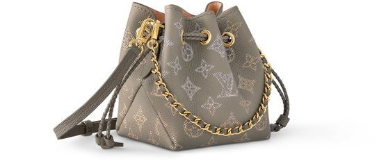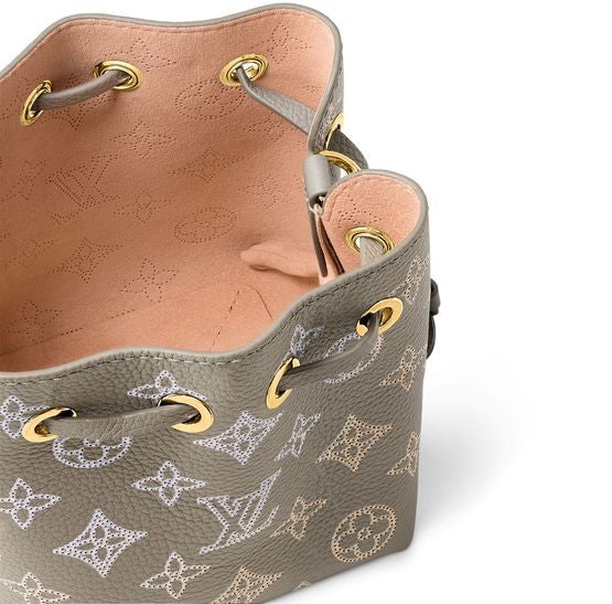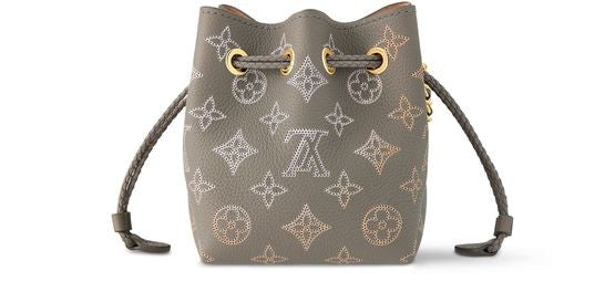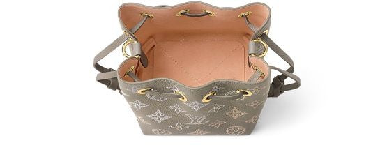 説明 : ミニバッグ, ドローストリング開閉式, プリントロゴ, ブランドモノグラム, 全面ロゴ, 手持ち, 肩掛け, 総柄, 飾りステッチ, ナローストラップ.