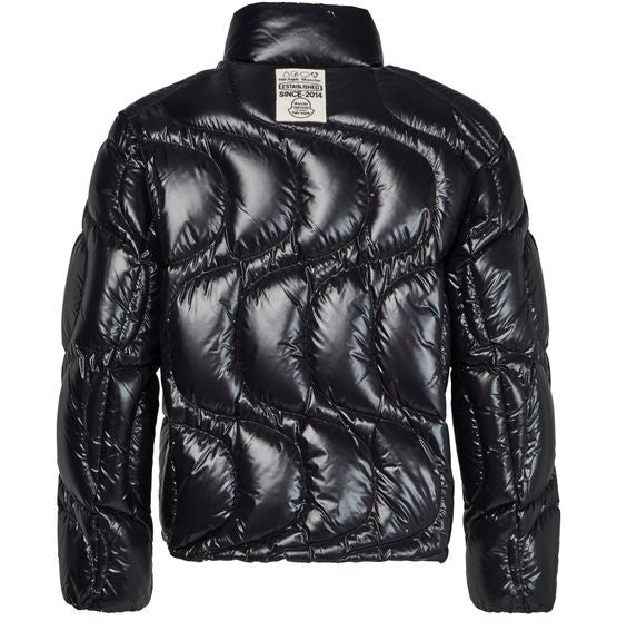 説明 : フロントボタン留め, パッド入り, 背面ロゴ, 胸元ロゴ, アップリケロゴ, ショート, サイドポケット, ロングスリーブ, パフジャケット, ハイネック.