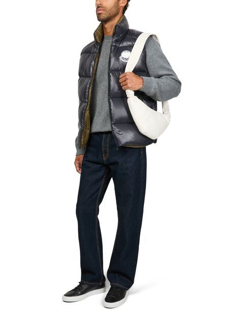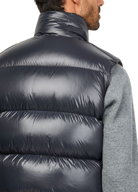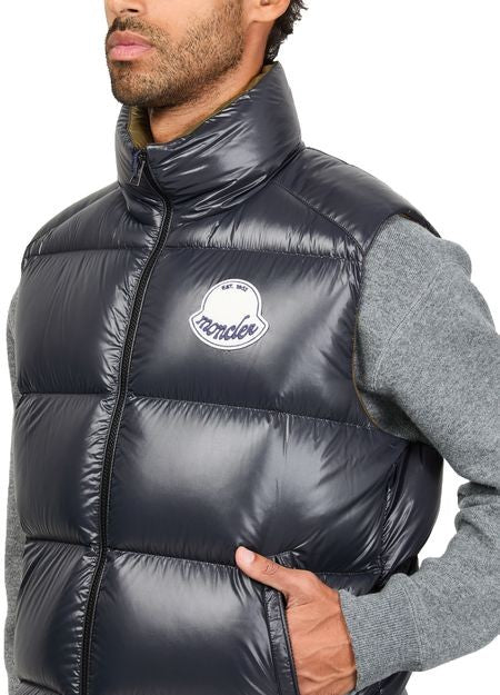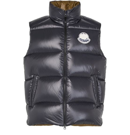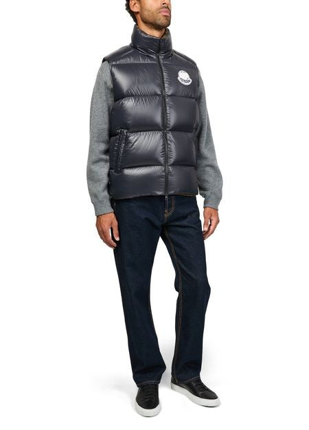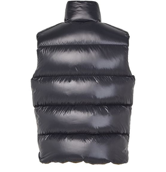 説明 : Chest logo, short, high neck, sleeveless, side pockets, zipper closure, padded texture.