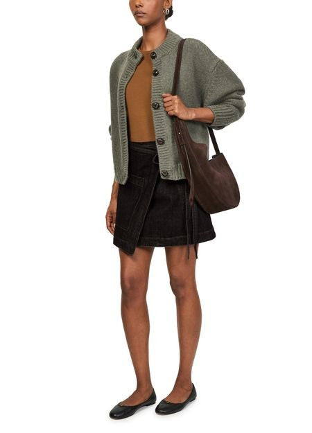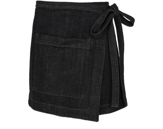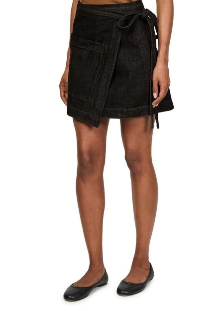 説明 : Denim, mini length, large front pocket, belted waist, visible stitching, contrast stitching, bow fastening, belt loops, wrap skirt.