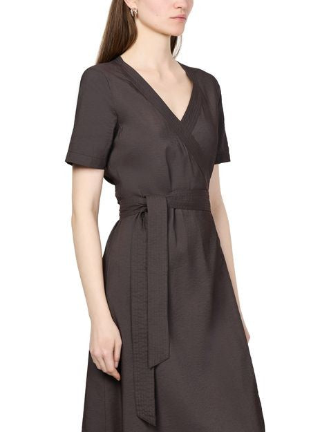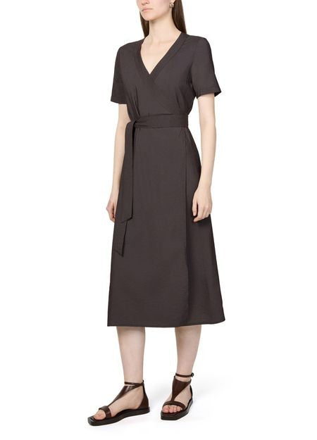 説明 : ショートスリーブ, vネック, 目に見えるステッチ, アップリケロゴ, フレアドレス, ミディドレス, ベルト付きウエスト.
