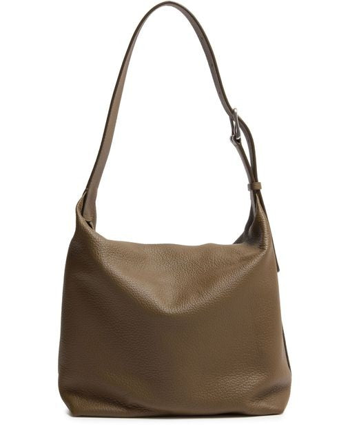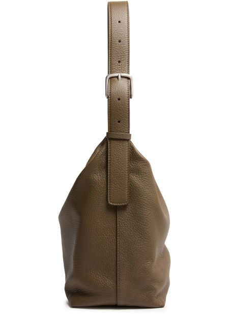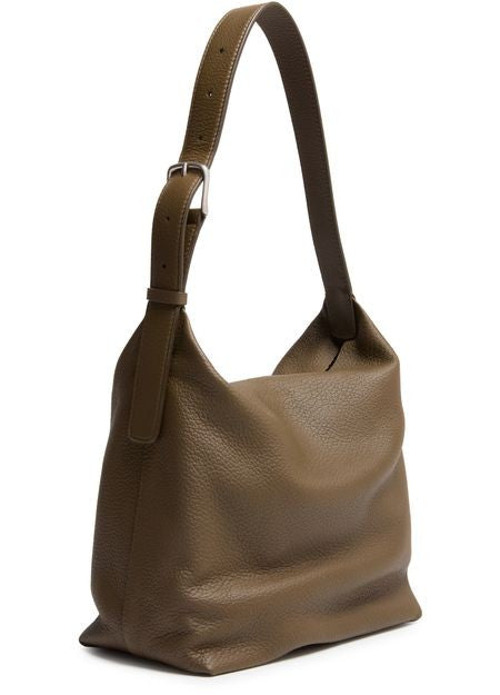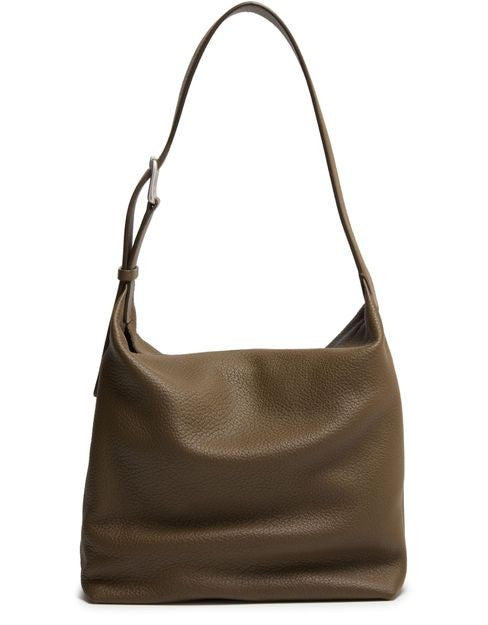 説明 : Shoulder bag, single handle, leather handle, grained leather, visible topstitching, silver finish.