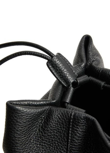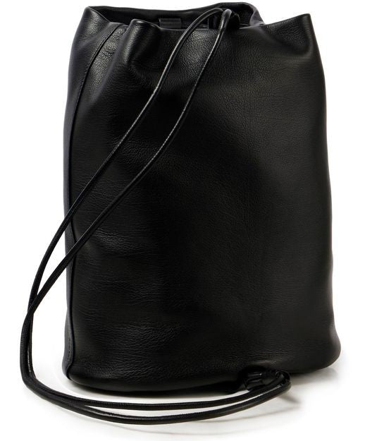 説明 : small bucket bag, backpack, grained leather, thin strap, large interior compartment, drawstring closure.