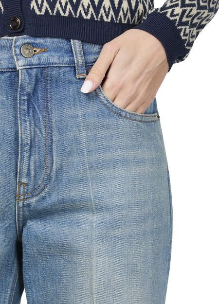 説明 : ボタン&コンシールファスナー開閉, ベルトループ, 背面レザーロゴ, 目に見えるステッチ, アンクル丈, ファイブポケットスタイル, ストレートカット, デニム, ローウエストフィット.