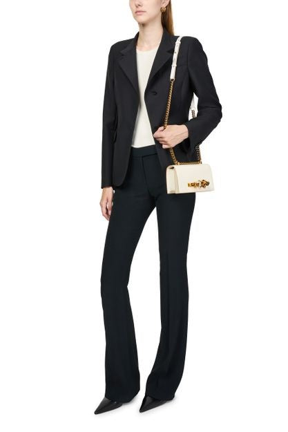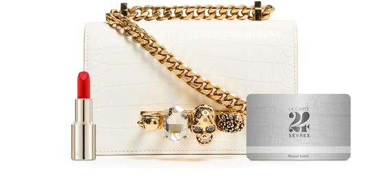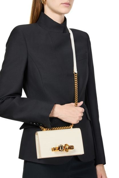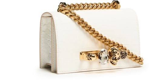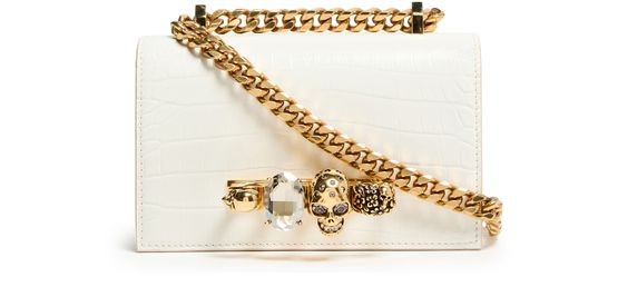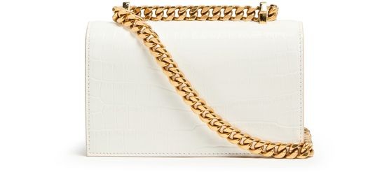 説明 : mini bag, crocodile-embossed leather, chain strap, interior slots for cards, single compartment, gold clasp, flap closure, gold finish.