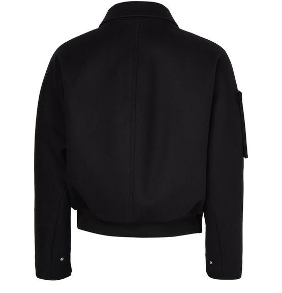 説明 : Embroidered chest logo, short, long-sleeved, welt pockets, zipper closure, silver finish.