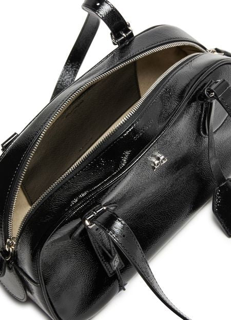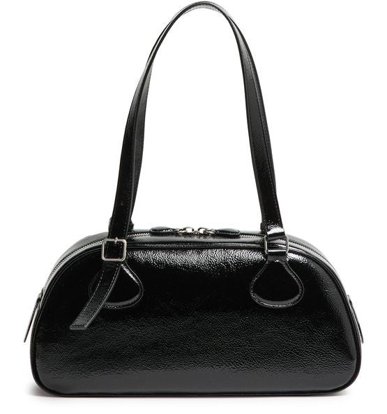 説明 : Shoulder bag, double handles, leather handle, front logo, patent leather, zipper closure, metal finish.