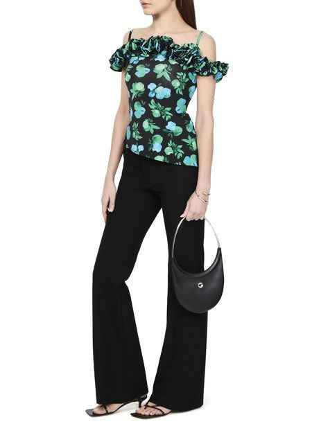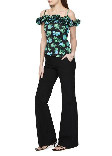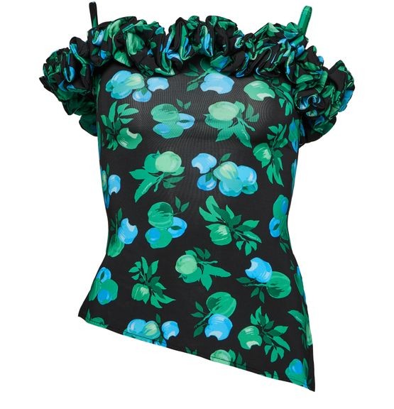 説明 : アシンメトリーカット, ラッフルのディテール, スパゲッティストラップ/細いショルダーストラップ, 目に見えるステッチ, レギュラーレングス, 総柄, 花柄, ブラウス, フィットウエスト.