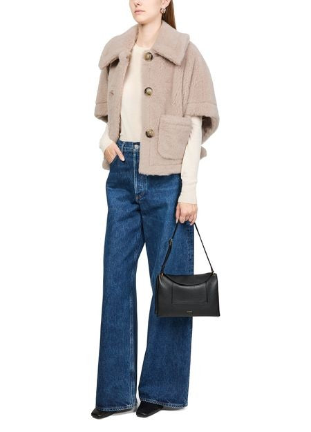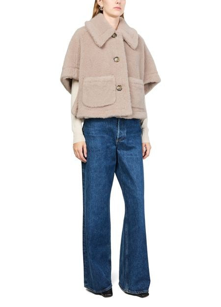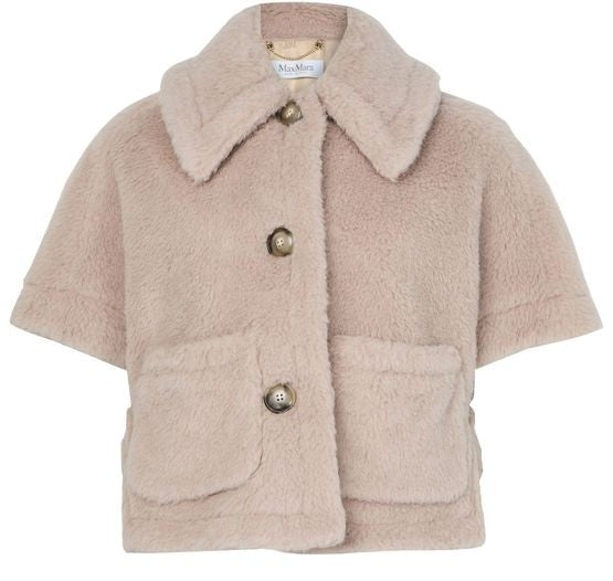 説明 : Crop, dropped sleeve, short-sleeved, button fastening, fur detail.