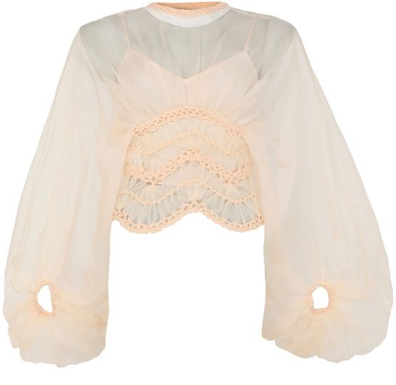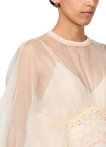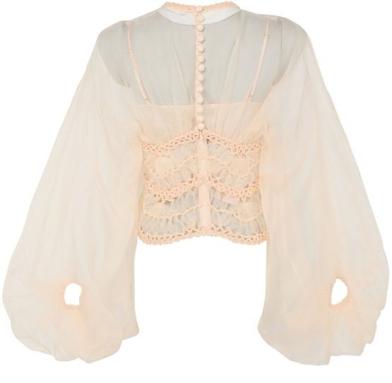 説明 : レースのディテール, 後ろボタン留め, 目に見えるステッチ, ラウンドネック, ブラウス, ロングスリーブ, パフ, ルーズフィット, レギュラーレングス.